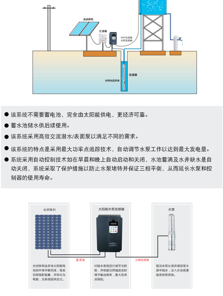 易用性好:只需將太陽能板接入變頻器,通電后即可實現(xiàn)交流水泵自動啟動